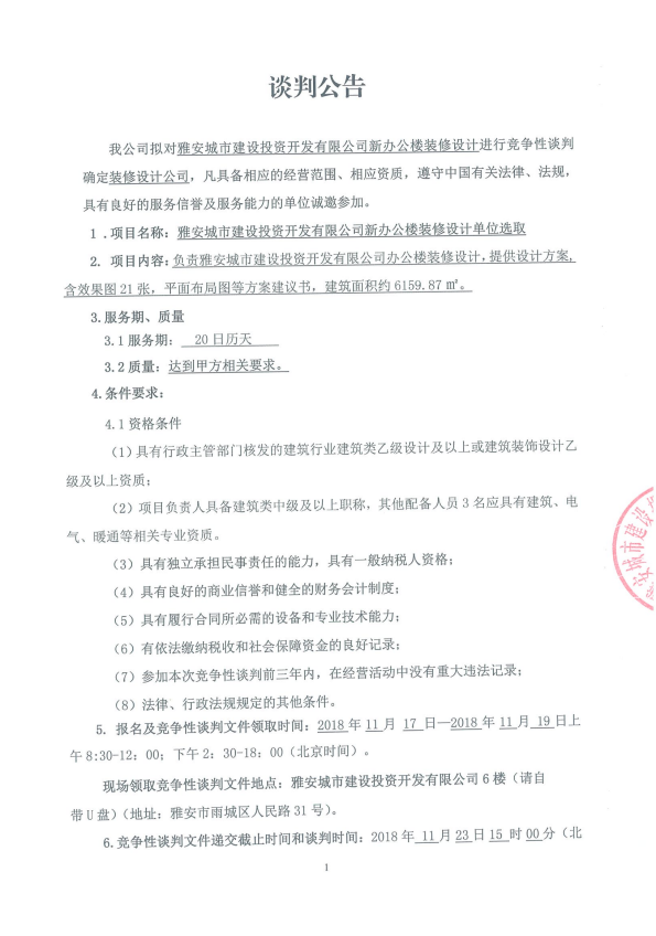 雅安城市建設(shè)投資開發(fā)有限公司新辦公樓裝修設(shè)計方案競爭性談判