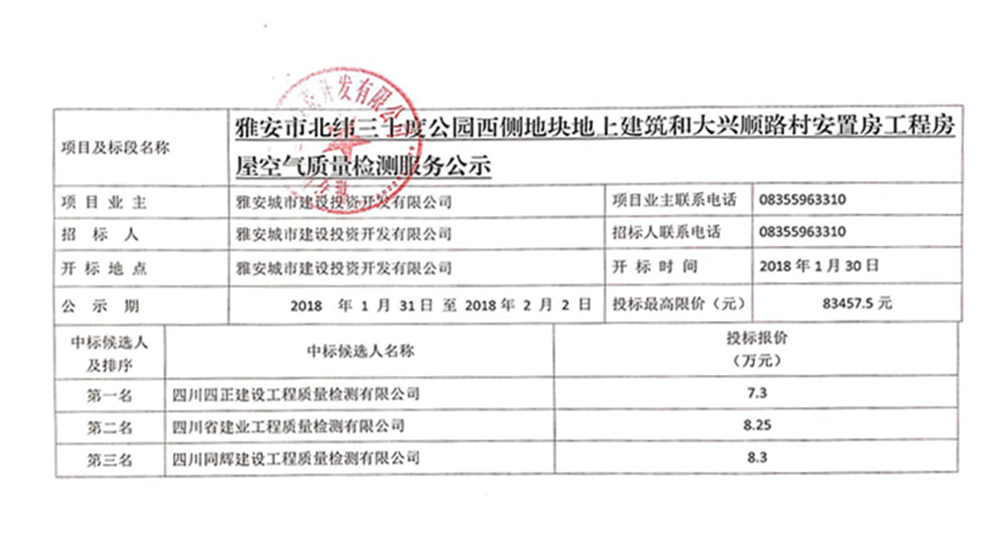 雅安市北緯三十度公園西側(cè)地塊地上建筑工程和大興順路村安置房工程房屋空氣質(zhì)量檢測服務公示