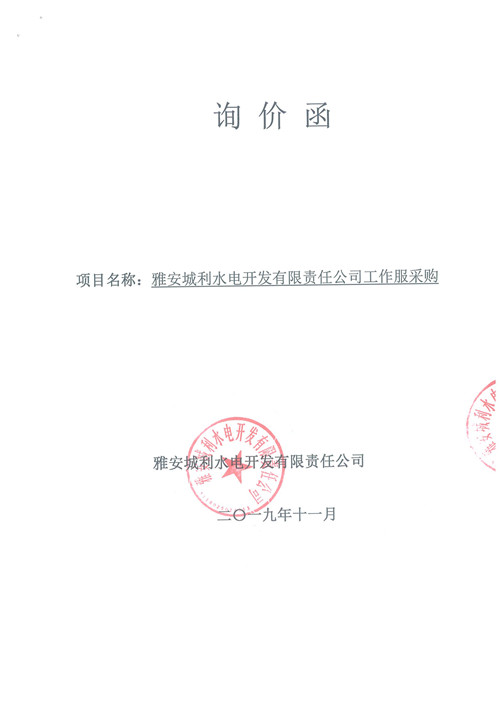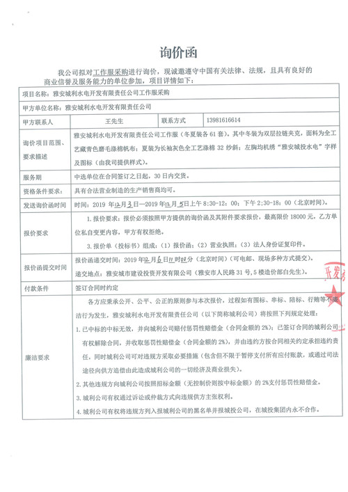 雅安城利水電開發(fā)有限責(zé)任公司工作服采購(gòu)詢價(jià)函