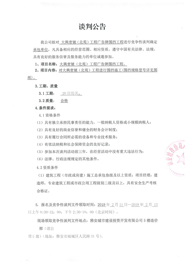 大興壹號(hào)(北苑)工程廣告牌圍擋工程競(jìng)爭(zhēng)性談判公告