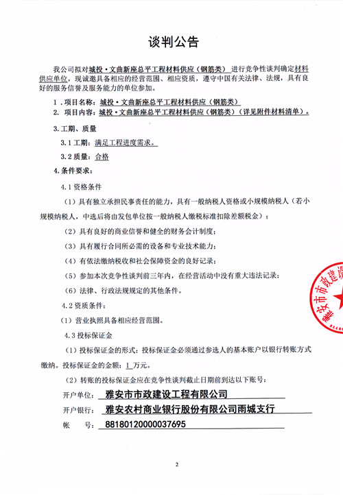 市政公司城投·文曲新座總平工程材料供應(yīng)(鋼筋類)競爭性談判公告