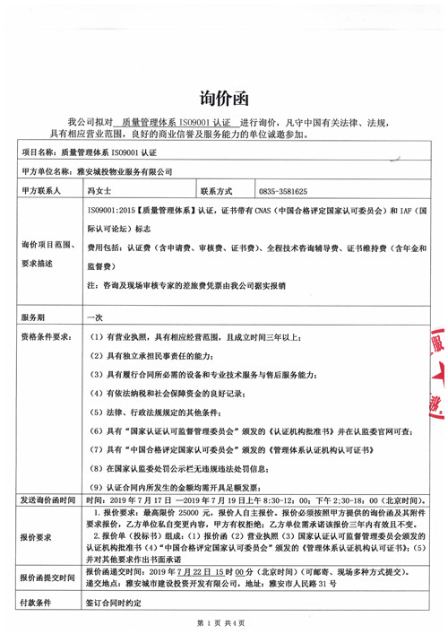 城投物業(yè)質(zhì)量管理體系IS09001認(rèn)證詢價函