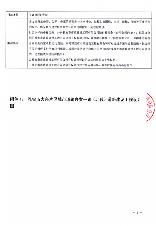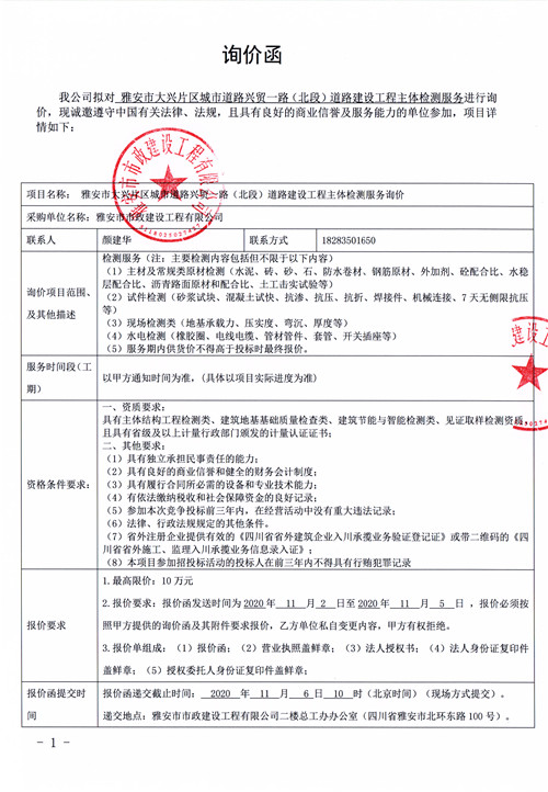 雅安市大興片區(qū)城市道路興貿(mào)一路(北段)道路建設(shè)工程主體檢測服務(wù)詢價函