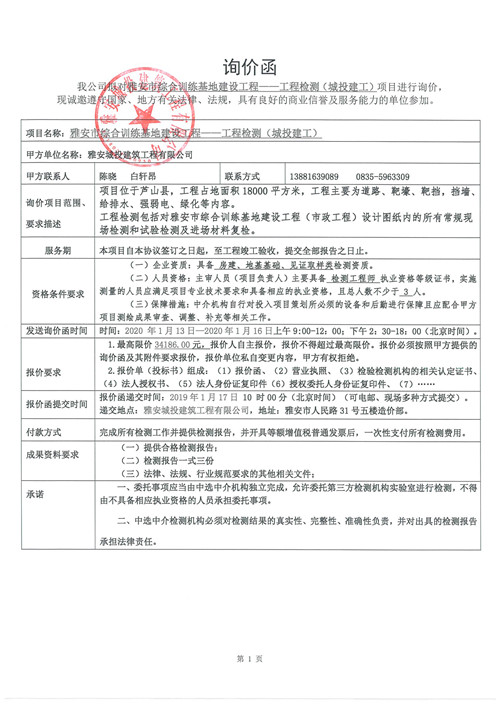 雅安市綜合訓(xùn)練基地建設(shè)工程——工程檢測(cè)詢價(jià)函(第二次)