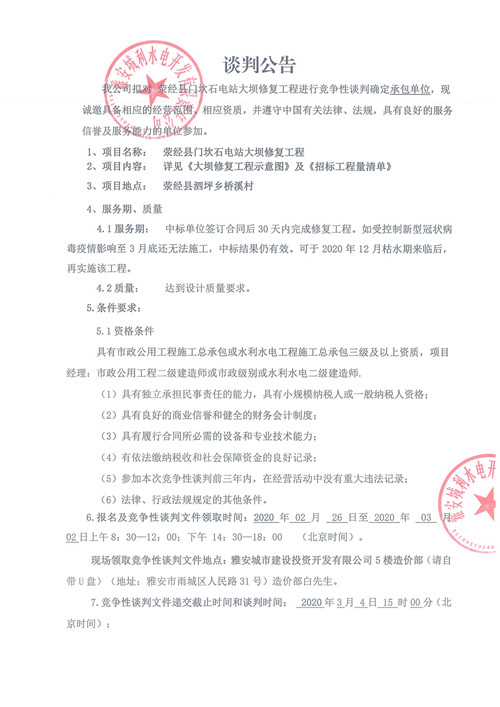 滎經(jīng)縣門坎石電站大壩修復工程競爭性談判公告