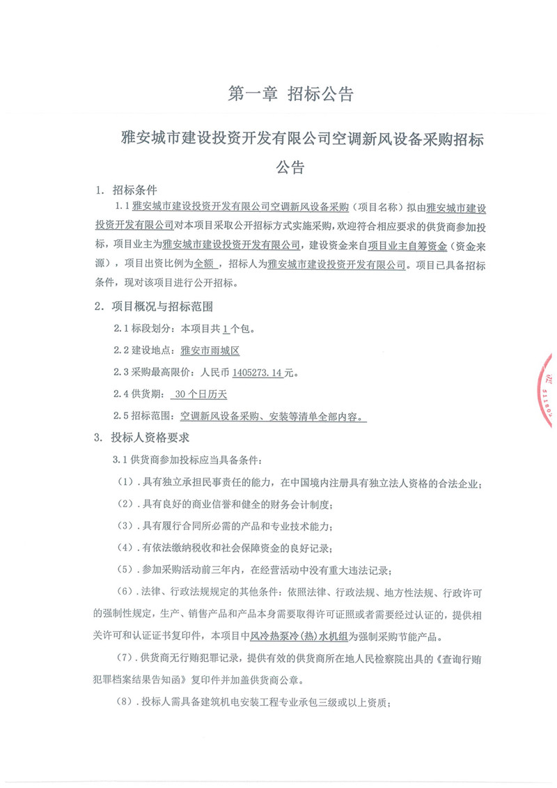 雅安城市建設(shè)投資開發(fā)有限公司空調(diào)新風(fēng)設(shè)備采購招標(biāo)公告