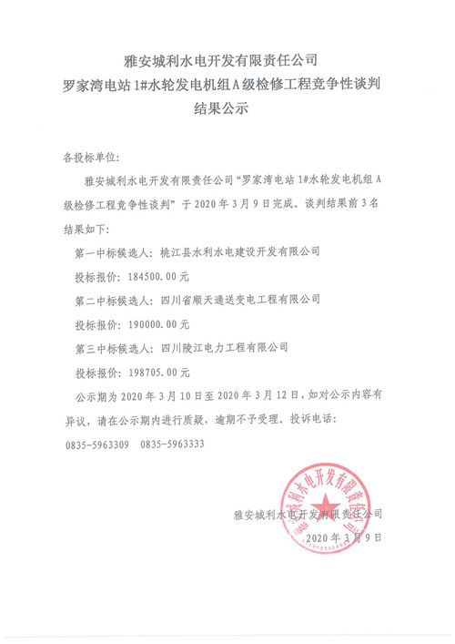 羅家灣電站1#水輪發(fā)電機組A級檢修工程競爭性談判結(jié)果公示