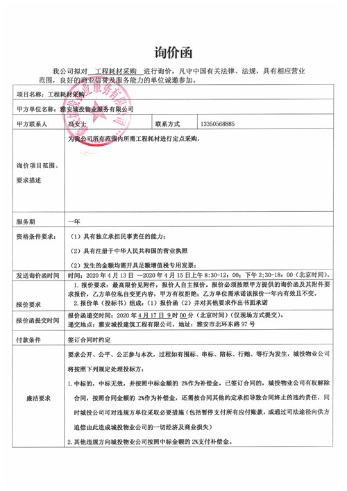 城投物業(yè)公司工程耗材采購詢價函(第二次)