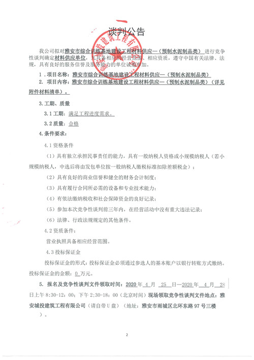 城投建工雅安市綜合訓練基地建設(shè)工程材料供應—(預制水泥制品類)競爭性談判公告(第二次)
