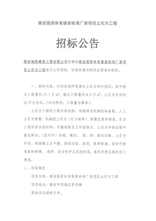 城投建工公司雅安國(guó)資體育服裝標(biāo)準(zhǔn)廠(chǎng)房項(xiàng)目土石方工程招標(biāo)公告