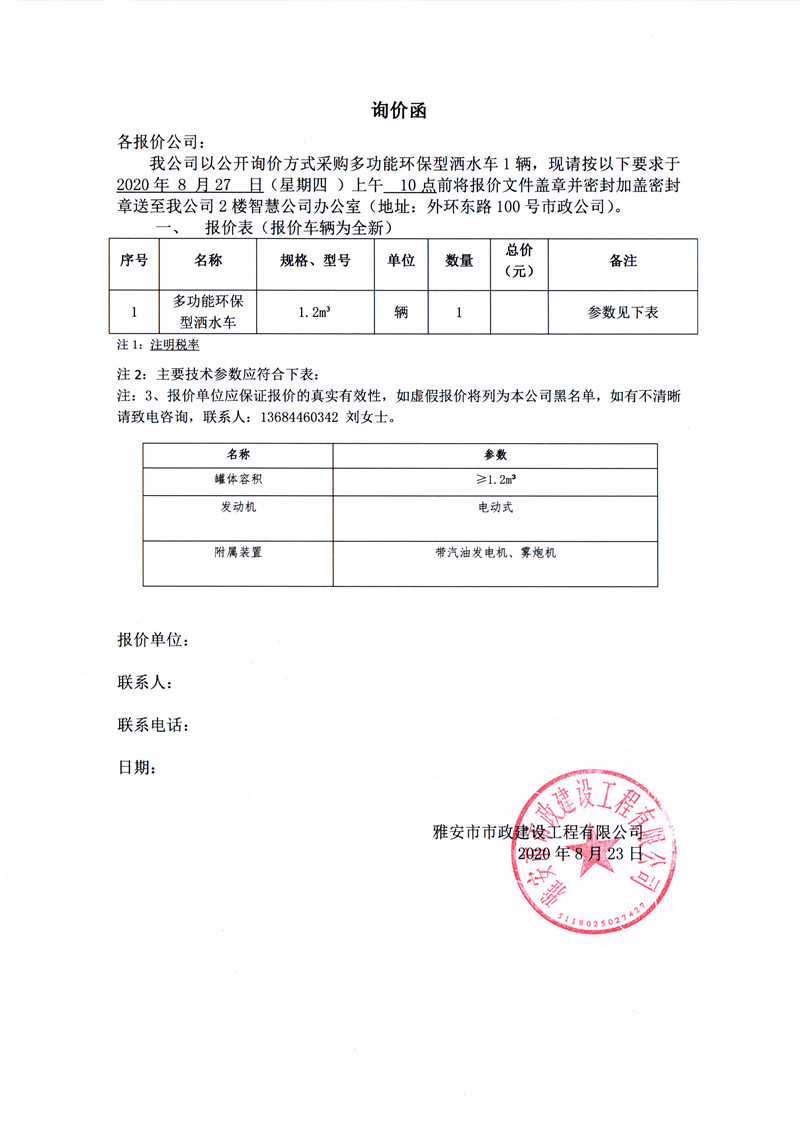 雅安市市政建設(shè)工程有限公司采購(gòu)多功能環(huán)保型灑水車詢價(jià)函