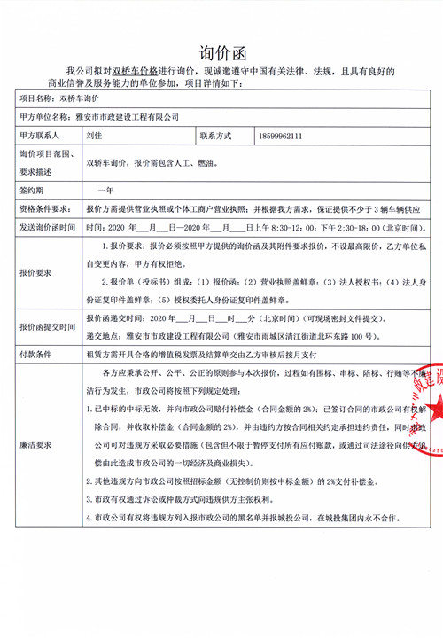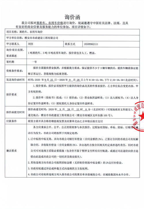 詢價函(黑豹車、農(nóng)用車、雙橋車租賃)