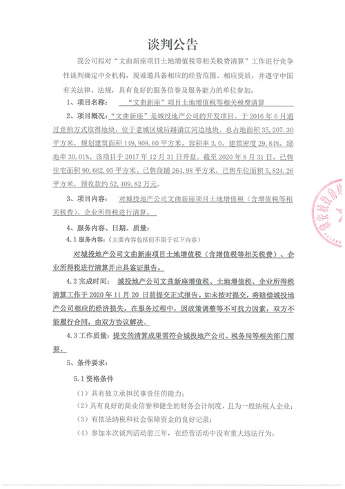 城投房地產(chǎn)公司“文曲新座項(xiàng)目土地增值稅等相關(guān)稅費(fèi)清算”工作競(jìng)爭(zhēng)性談判公告