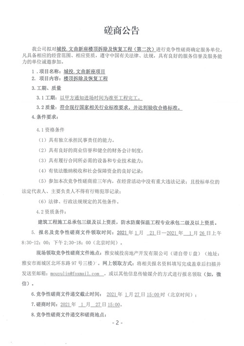 雅安城投房地產(chǎn)開(kāi)發(fā)有限公司城投·文曲新座樓頂拆除及恢復(fù)工程(第二次)競(jìng)爭(zhēng)性磋商公告