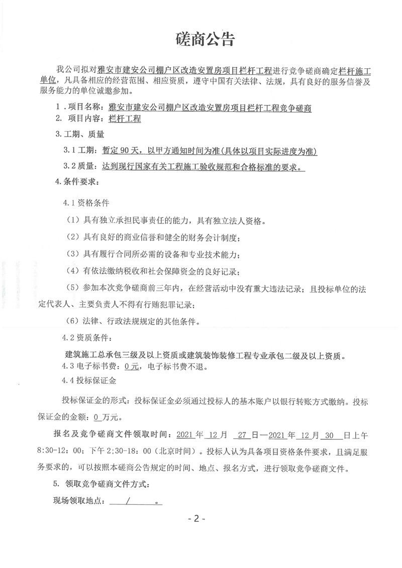 雅安市建安公司棚戶區(qū)改造安置房項(xiàng)目欄桿工程競爭磋商公告