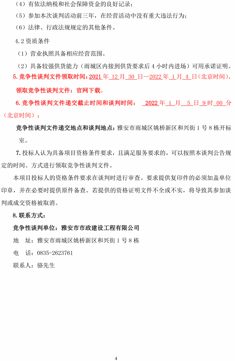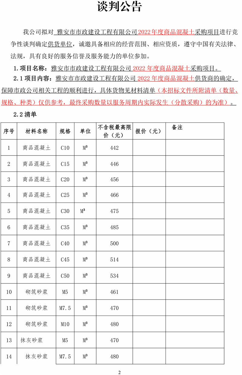 雅安市市政建設工程有限公司2022年度商品混凝土采購項目競爭性談判公告