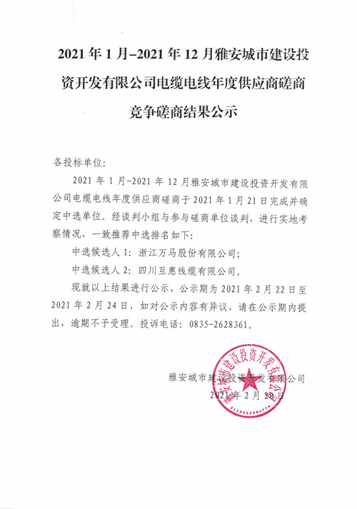 2021年1月-2021年12月雅安城市建設(shè)投資開發(fā)有限公司電纜電線年度供應(yīng)商磋商競(jìng)爭(zhēng)磋商結(jié)果公示