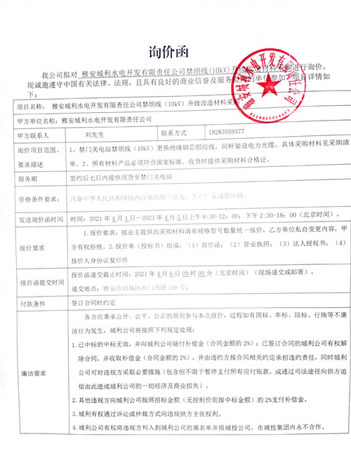 雅安城利水電開發(fā)有限責(zé)任公司禁壩線(10kv)升級改造材料采購詢價函