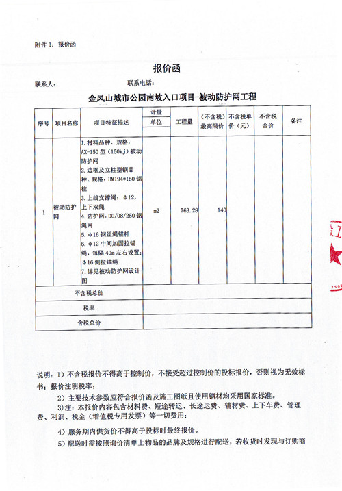 雅安市政公司金鳳山公園南坡入口項目-被動防護(hù)網(wǎng)材料詢價函