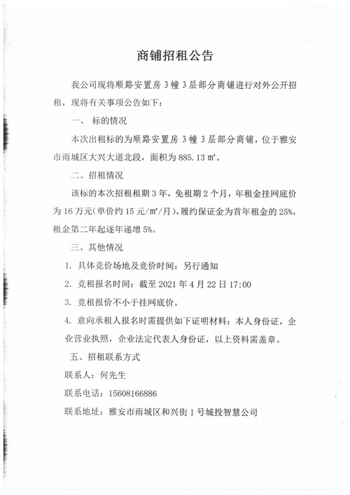 順路安置房3幢3層部分商鋪招租公告