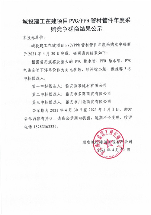 城投建工在建項目PVC/PPR管材年度采購磋商結果公示