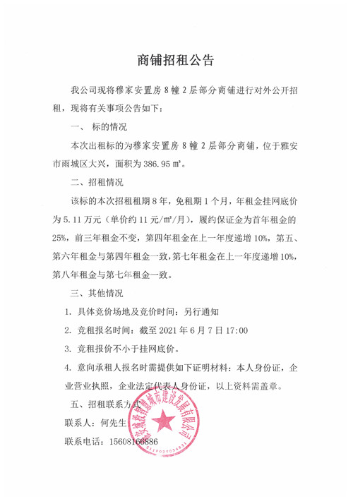 城投智慧公司穆家安置房8幢2層部分商鋪招租公告