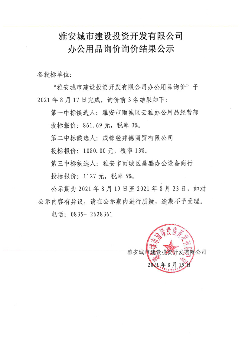 城投公司辦公用品詢(xún)價(jià)結(jié)果公示