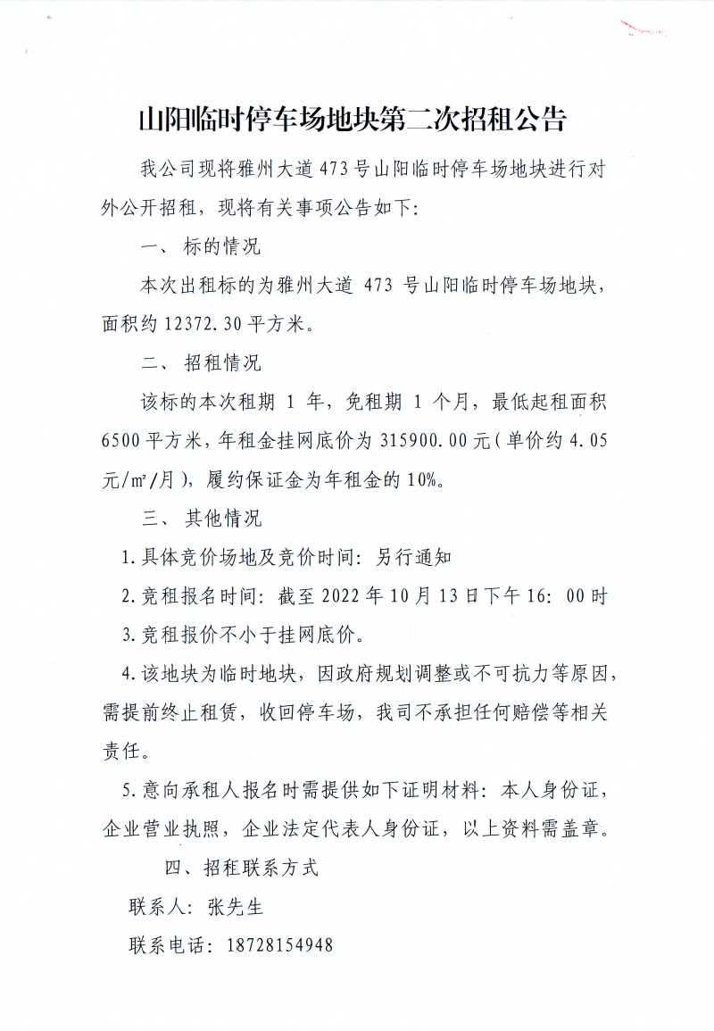 山陽(yáng)臨時(shí)停車場(chǎng)地塊第二次招租公告