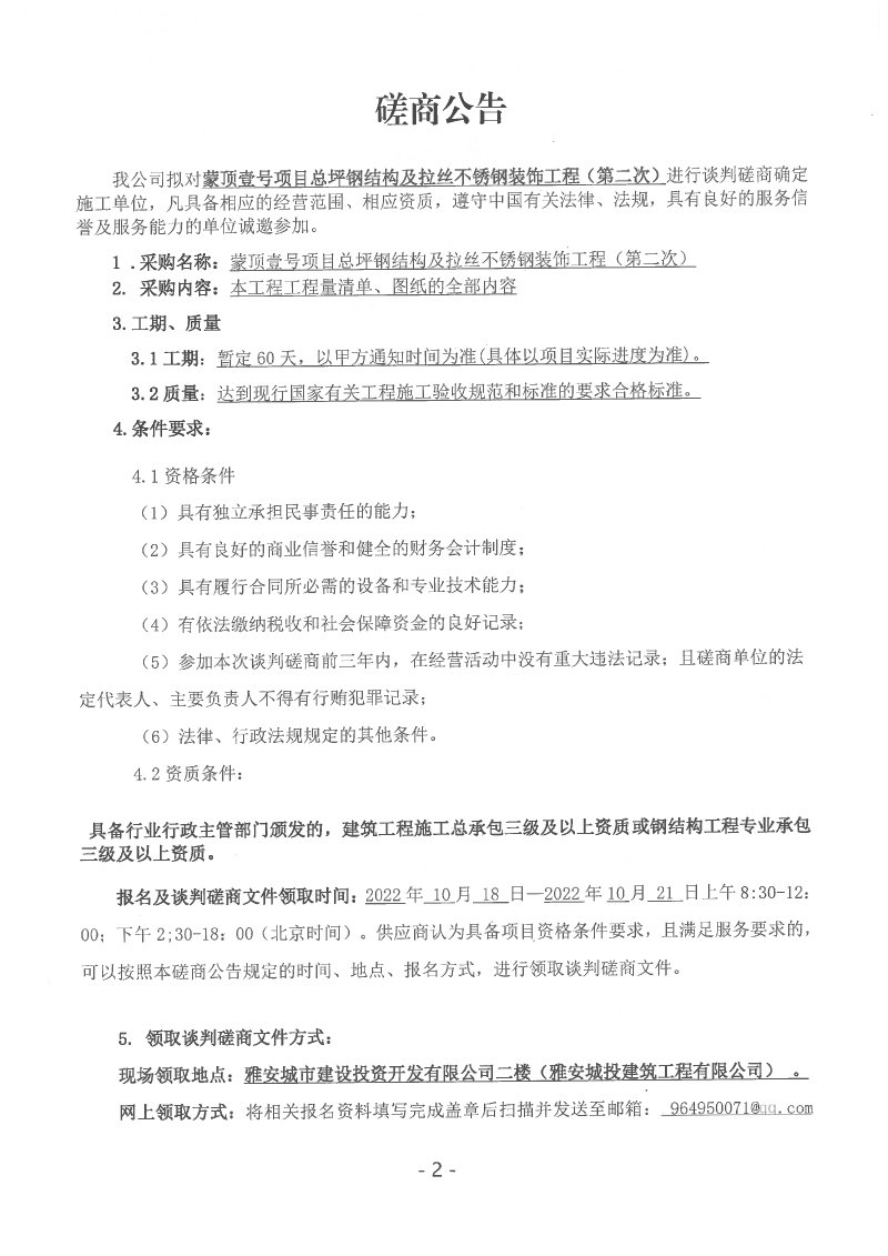 蒙頂壹號項(xiàng)目總坪鋼結(jié)構(gòu)及拉絲不銹鋼裝飾工程(第二次)談判磋商公告