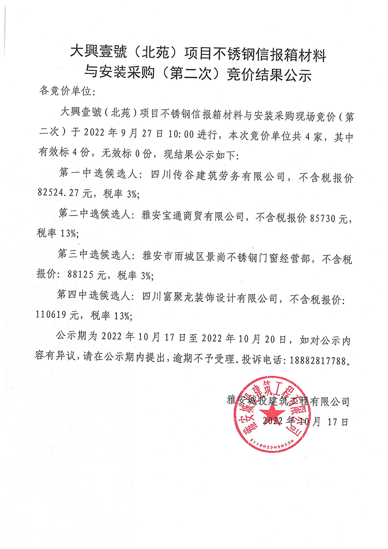 大興壹號(北苑)項目不銹鋼信報箱材料與安裝采購(第二次)競價結(jié)果公示