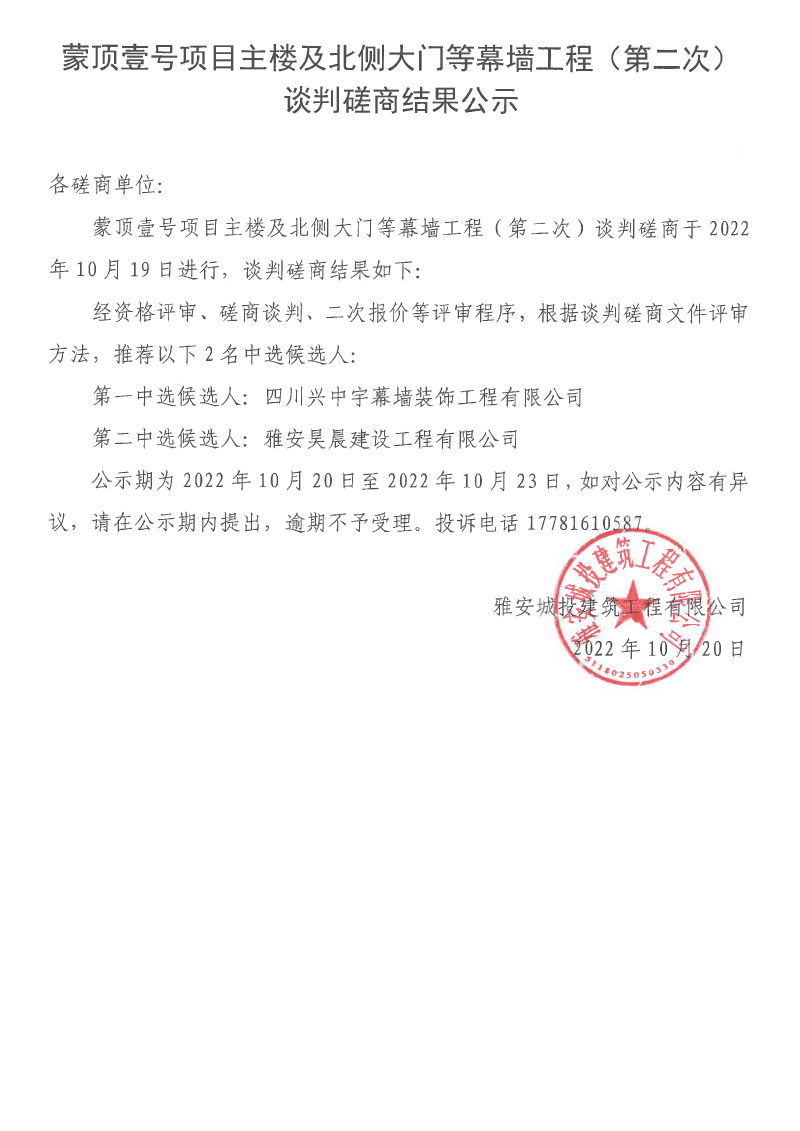 蒙頂壹號項目主樓及北側(cè)大門等幕墻工程(第二次)談判磋商結(jié)果公示