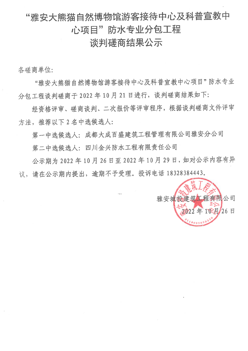 雅安大熊貓自然博物館游客接待中心及科普宣教中心項目防水專業(yè)分包工程談判磋商結果公示