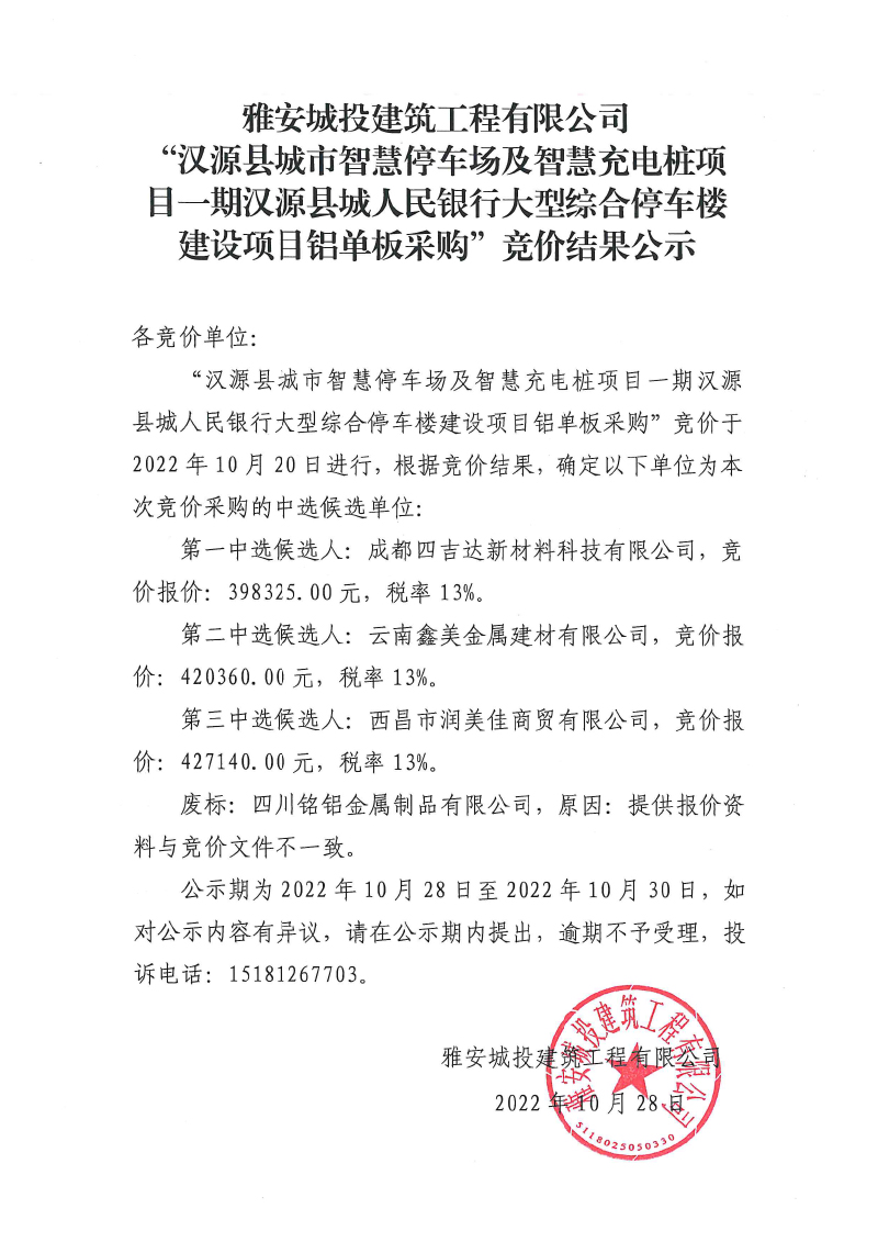 漢源縣城市智慧停車場及智慧充電樁項目一期漢源縣城人民銀行大型綜合樓停車樓建設(shè)項目鋁單板材料采購競價結(jié)果公示