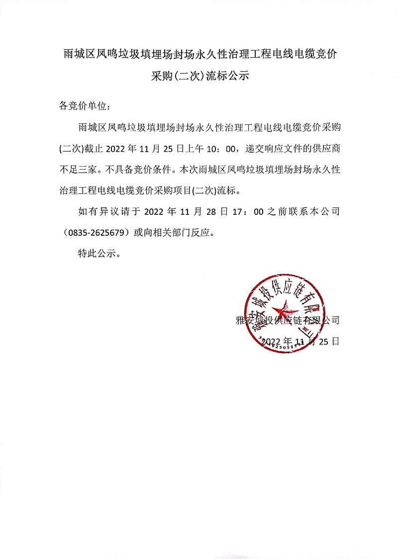 雨城區(qū)鳳鳴垃圾填埋場(chǎng)封場(chǎng)永久性治理工程電線(xiàn)電纜競(jìng)價(jià)采購(gòu)(二次)流標(biāo)公示