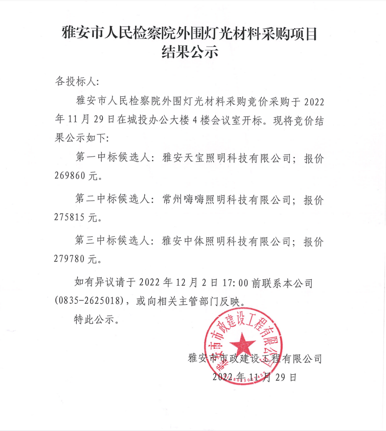 雅安市人民檢察院外圍燈光材料采購項(xiàng)目結(jié)果公示