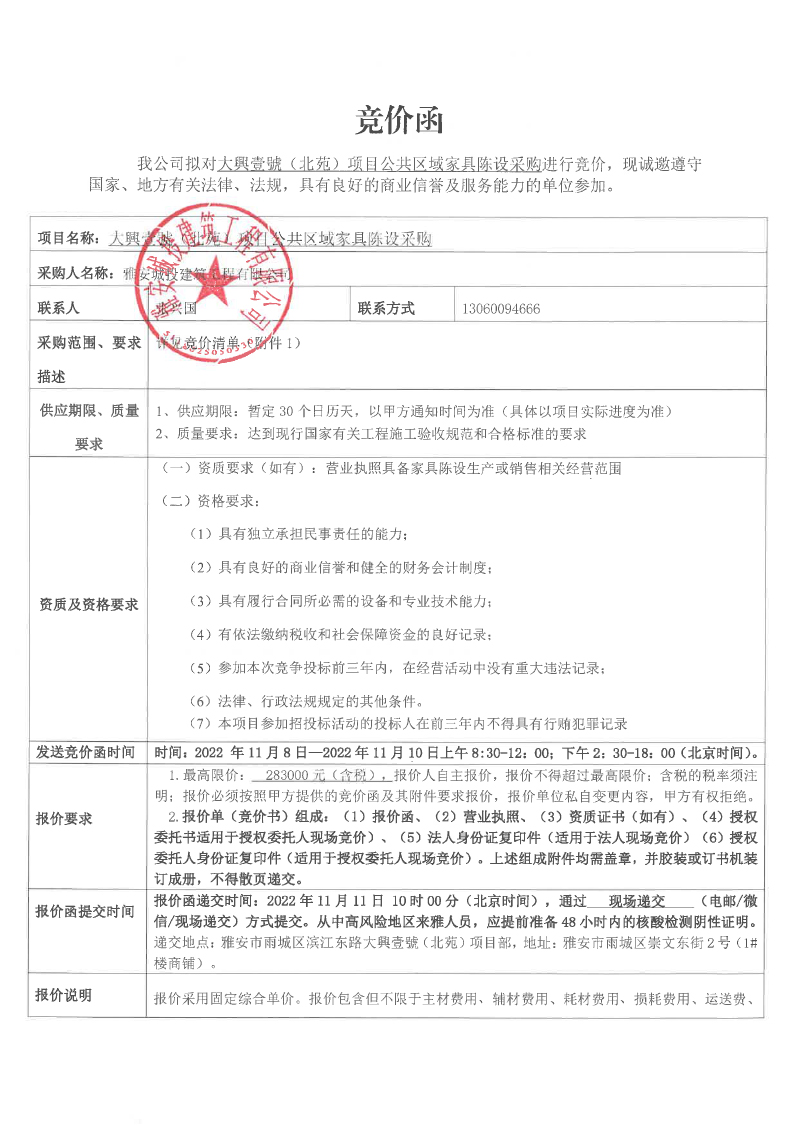 大興壹號(hào)(北苑)項(xiàng)目公共區(qū)域家具陳設(shè)采購競價(jià)函