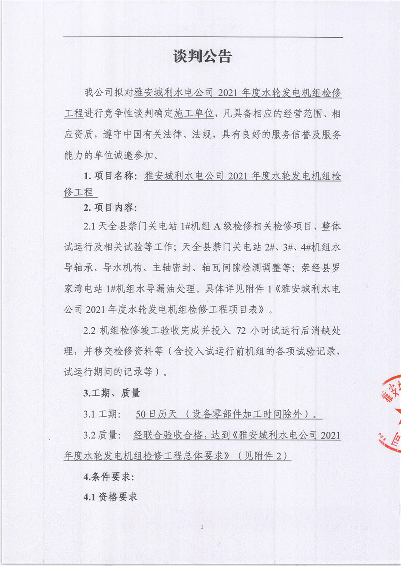 雅安城利水電公司2021年度水輪發(fā)電機檢修工程競爭性談判公告