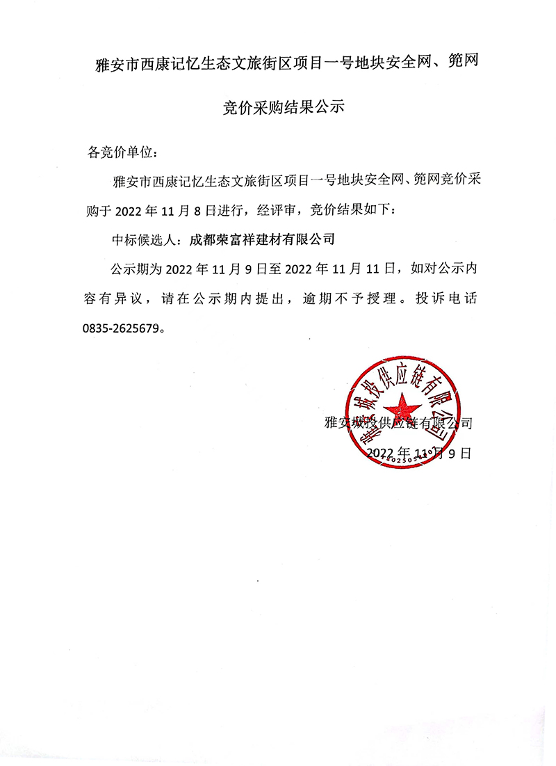 雅安市西康記憶生態(tài)文旅街區(qū)項目一號地塊安全網(wǎng)、篼網(wǎng)材料采購競價結果公示
