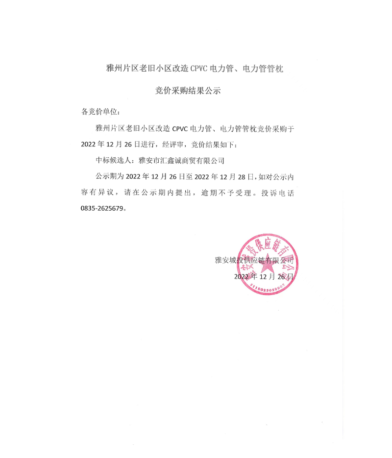 雅州片區(qū)老舊小區(qū)改造CPVC電力管、電力管管枕競(jìng)價(jià)采購結(jié)果公示