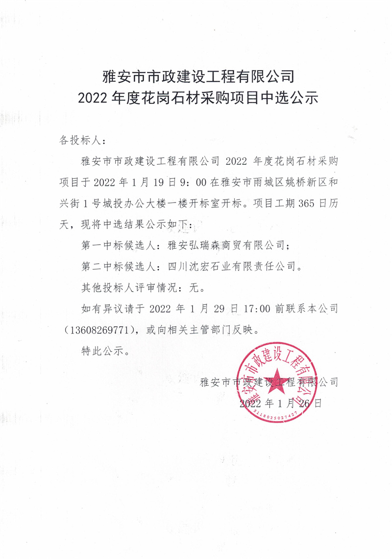 雅安市市政建設(shè)工程有限公司2022年度花崗石材采購項目中選公示