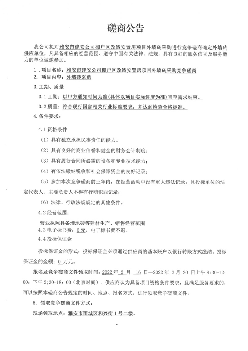 雅安市建安公司棚戶區(qū)改造安置房項(xiàng)目外墻磚采購競爭磋商公告