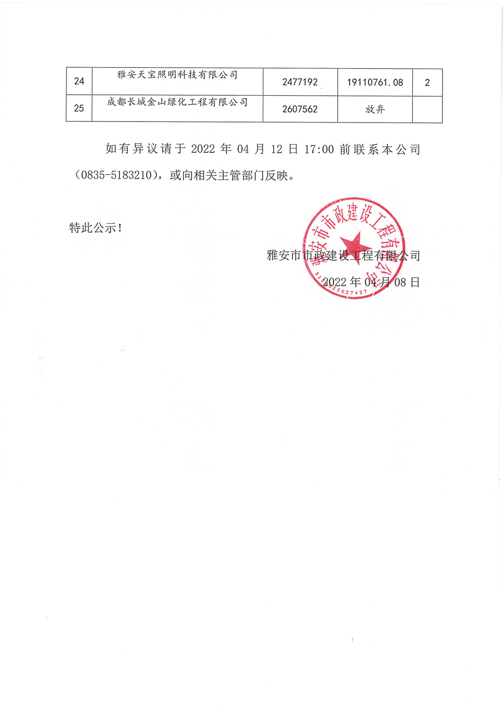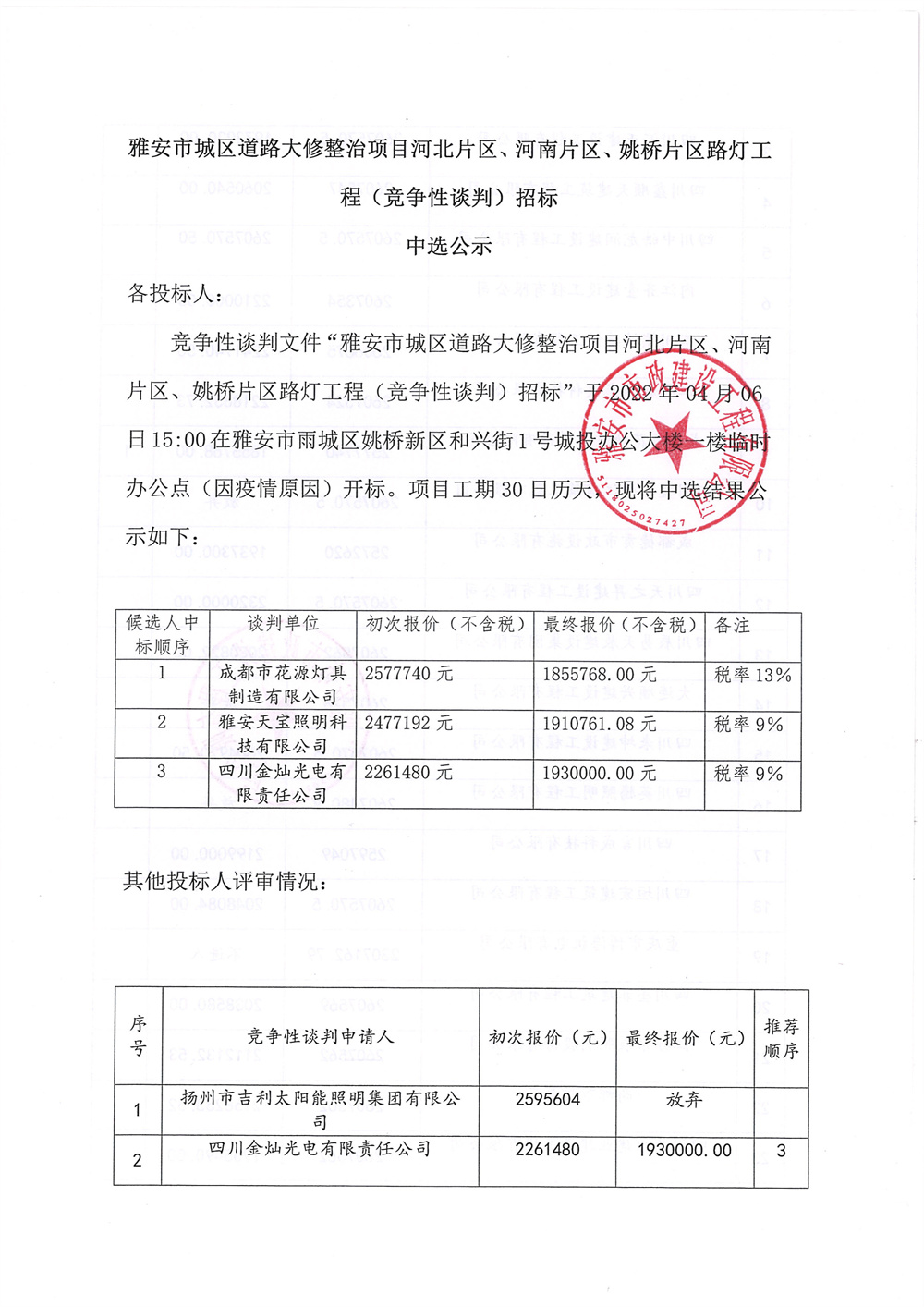 雅安市城區(qū)道路大修整治項目 河北片區(qū)、河南片區(qū)、姚橋片區(qū)路燈工程競爭性談判招標中選公示