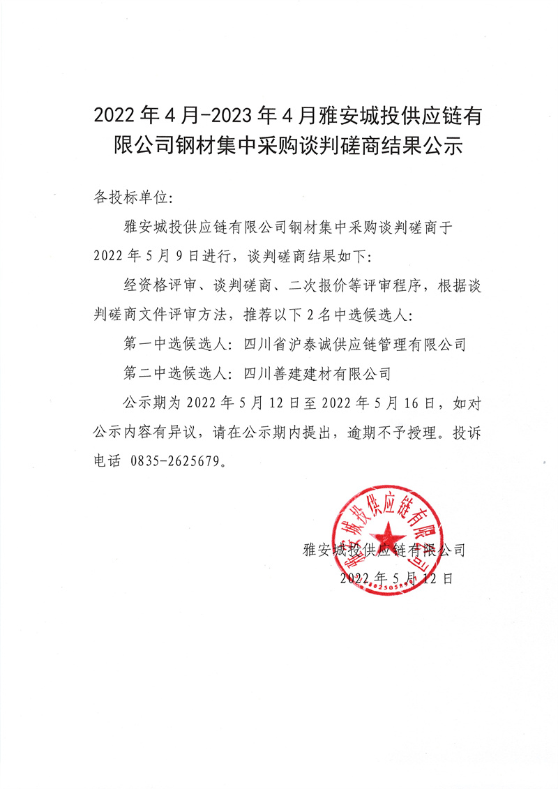 2022年4月-2023年4月雅安城投供應(yīng)鏈有限公司鋼材集中采購談判磋商結(jié)果公示