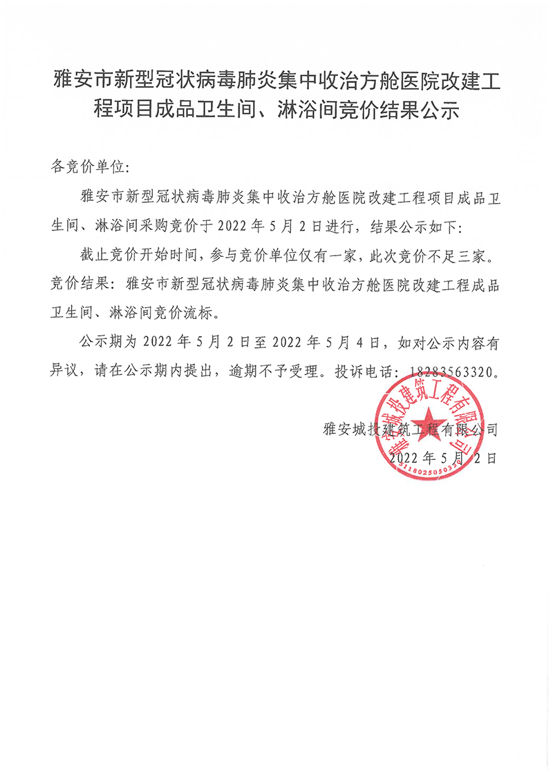 雅安市新型冠狀病毒肺炎集中收治方艙醫(yī)院改建工程項(xiàng)目成品衛(wèi)生間、淋浴間競(jìng)價(jià)結(jié)果公示