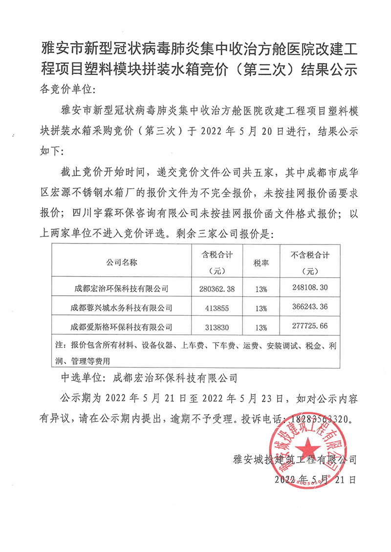 雅安市新型冠狀病毒肺炎集中收治方艙醫(yī)院改建工程項(xiàng)目塑料模塊拼裝水箱競價(第三次)結(jié)果公示