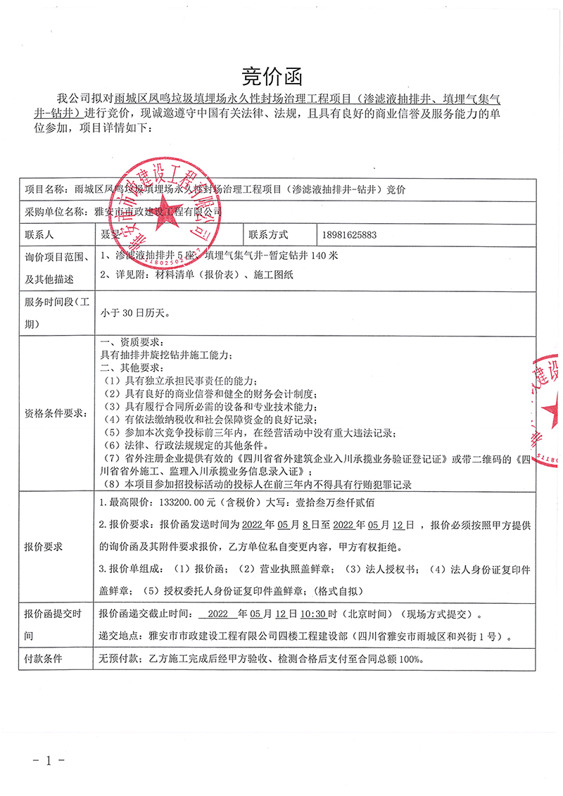 雨城區(qū)鳳鳴垃圾填埋場永久性封場治理工程項(xiàng)目(滲濾液抽排井、填埋氣集氣井鉆井)競價(jià)公告
