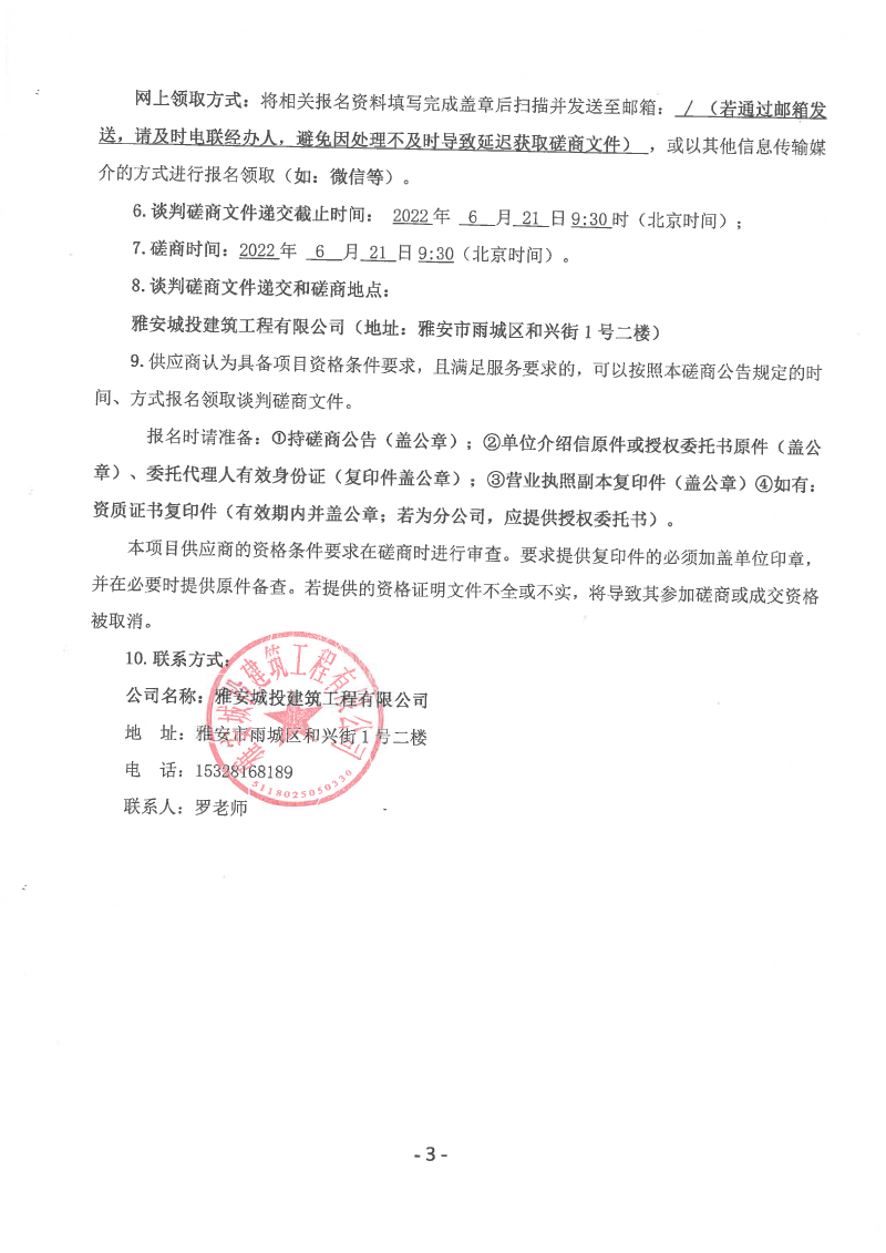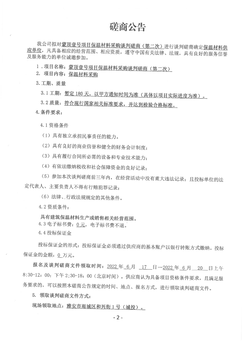 蒙頂壹號項目保溫材料采購談判磋商(第二次)公告