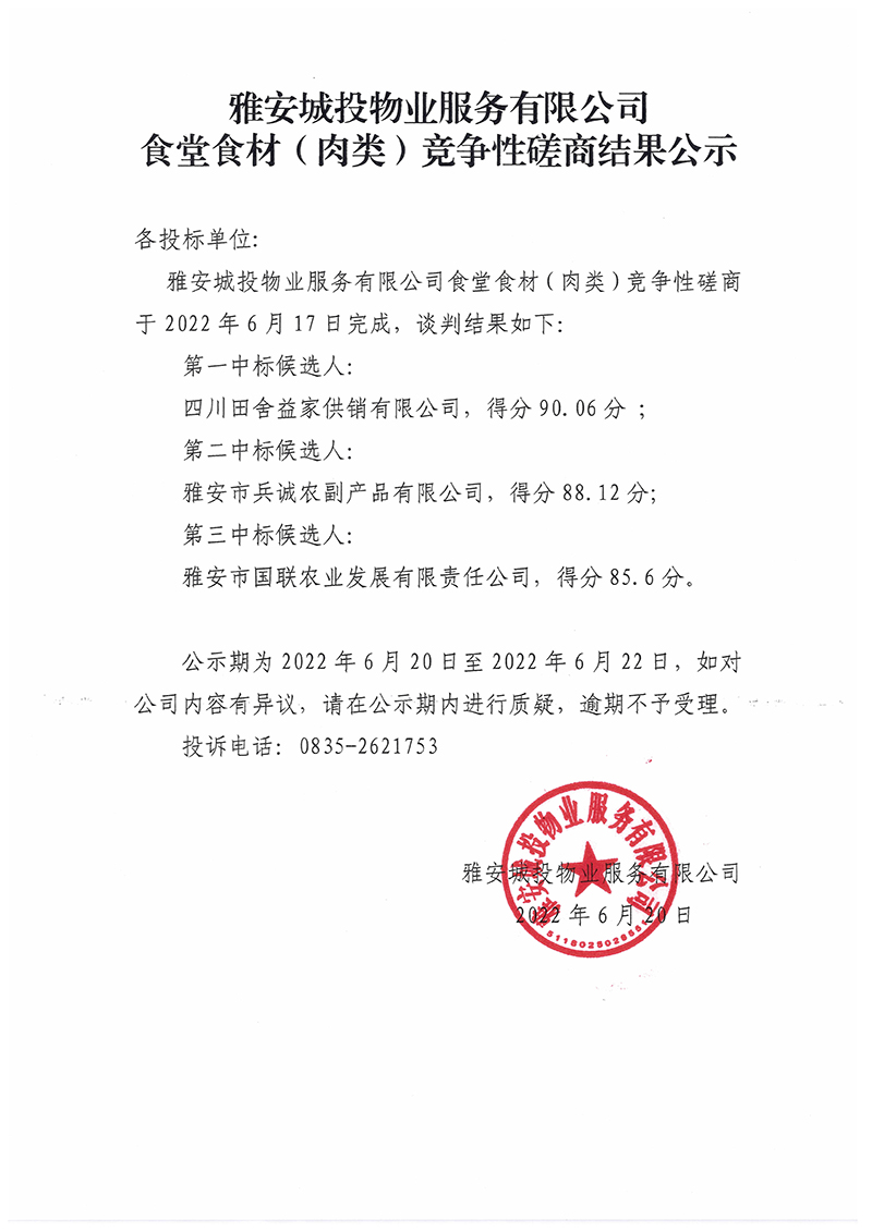 城投公司食堂食材(肉類(lèi))采購(gòu)項(xiàng)目競(jìng)爭(zhēng)性磋商結(jié)果公示