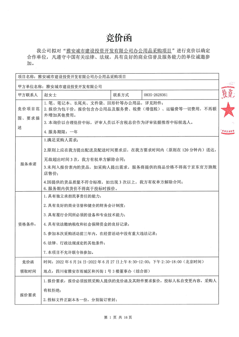 雅安城市建設(shè)投資開(kāi)發(fā)有限公司辦公用品采購(gòu)項(xiàng)目競(jìng)價(jià)公告