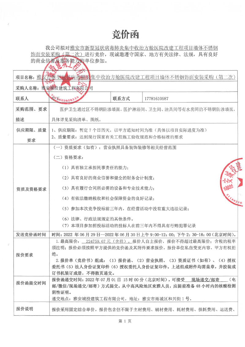雅安市新型冠狀病毒肺炎集中收治方艙醫(yī)院改建工程項(xiàng)目墻體不銹鋼飾面安裝競(jìng)價(jià)采購(第二次)